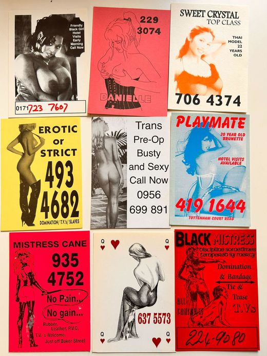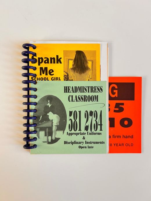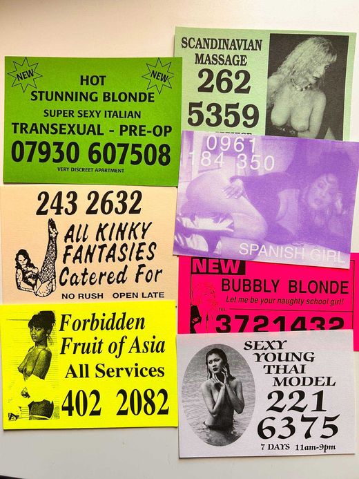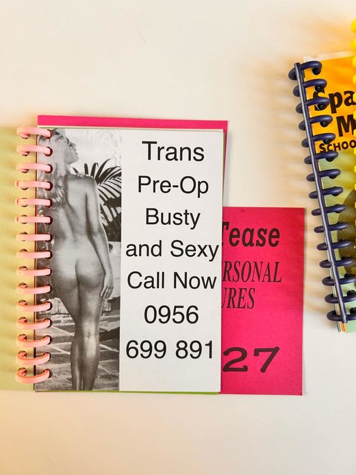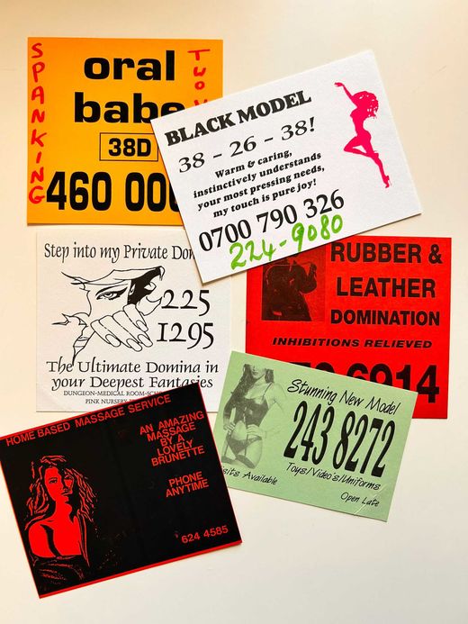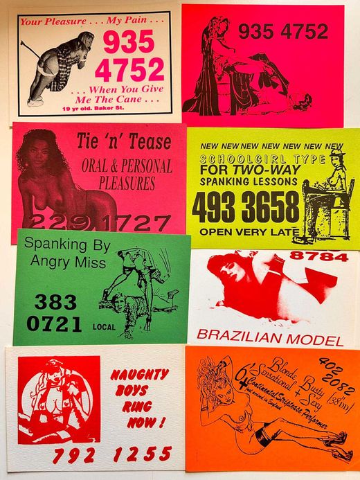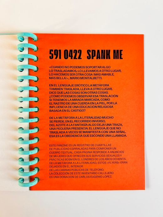 Este fanzine es un registro de cuartillas de publicidad espiraladas para componer un cuerpo textual. Cada página responde a anuncios de mujeres que ofrecen sus servicios sexuales y prácticas BDSM en el Londres de los años ochenta. De la metáfora a la literalidad, estos «flyers» eran dejados en el interior de las cabinas públicas de teléfono. La colección de este inventario callejero es una donación de Carlos Eugenio López.