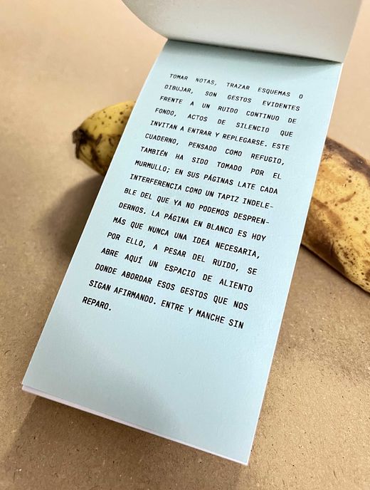 Tomar notas, trazar esquemas o dibujar, son gestos evidentes frente a un ruido continuo de fondo, actos de silencio que invitan a entrar y replegarse. Este cuaderno, pensado como refugio, también ha sido tomado por el murmullo; en sus páginas late la interferencia como un tapiz indeleble del que ya no podemos desprendernos. Es en este punto que habrá que empuñar la página en blanco como idea, a pesar del ruido, y seguir abriendo espacios de aliento donde dar con esos gestos que nos concreten. Entre y manche sin reparo.